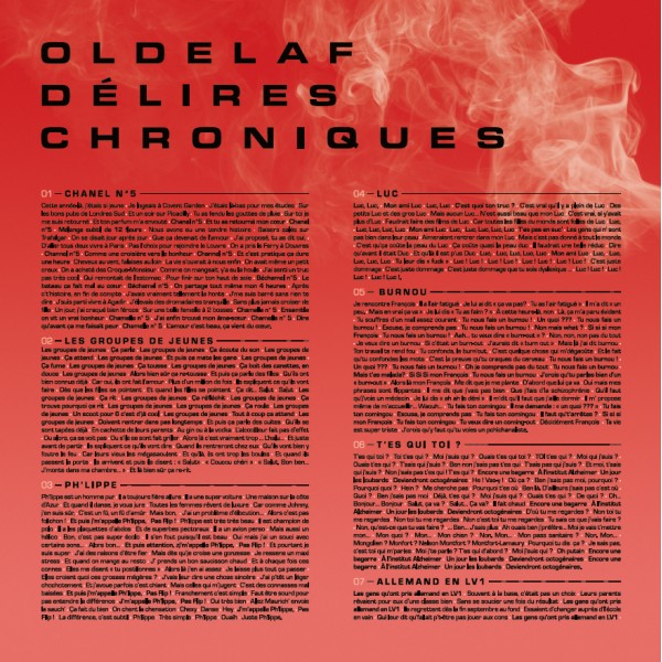 Oldelaf est inclassable : à la fois chanteur, humoriste, chroniqueur radio… “Délires chroniques” en est la synthèse : 12 chansons, drôles mais pas que, choisies parmi des centaines de chroniques journalières, composées avec brio (et sa guitare), avant d’être enregistrées pour donner naissance à ce nouvel album plein d’humour, mais aussi avec du cœur, du fond et pas mal de dérision.